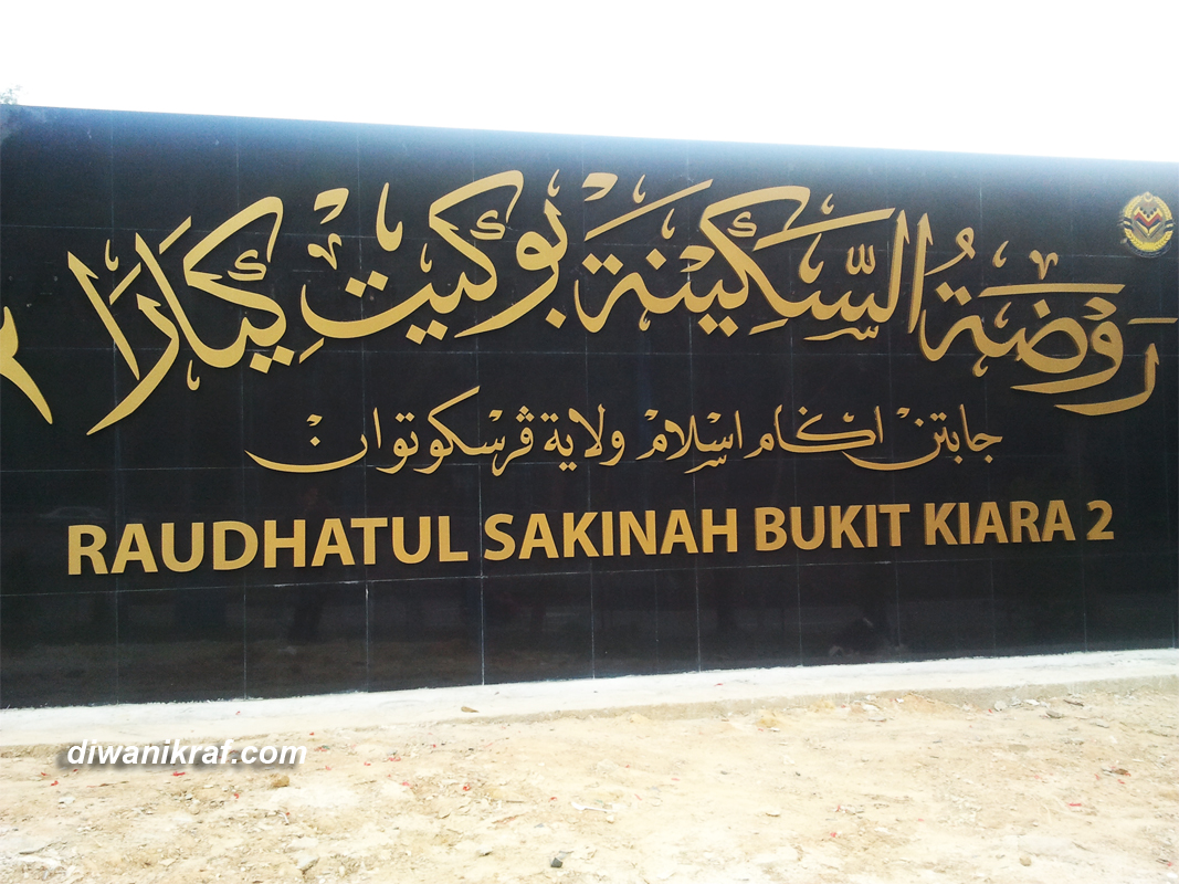 Tulisan khat di Raudhatul Sakinah Bukit Kiara 2 setinggi 7 kaki x 24 kaki yang dibuat box-up setebal 1 inci.