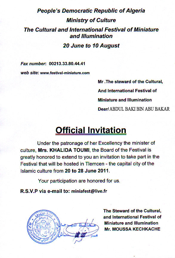 Today I will leave for Algeria to attend The International Festival of Miniature and Illumination at the invitation of the Algerian Ministry of Culture. The program will take place for 8 days from 20 to 28 of June 2011 in Tlemcen, Algeria. May Allah facilitate all of my affairs and hopefully everything goes smoothly.