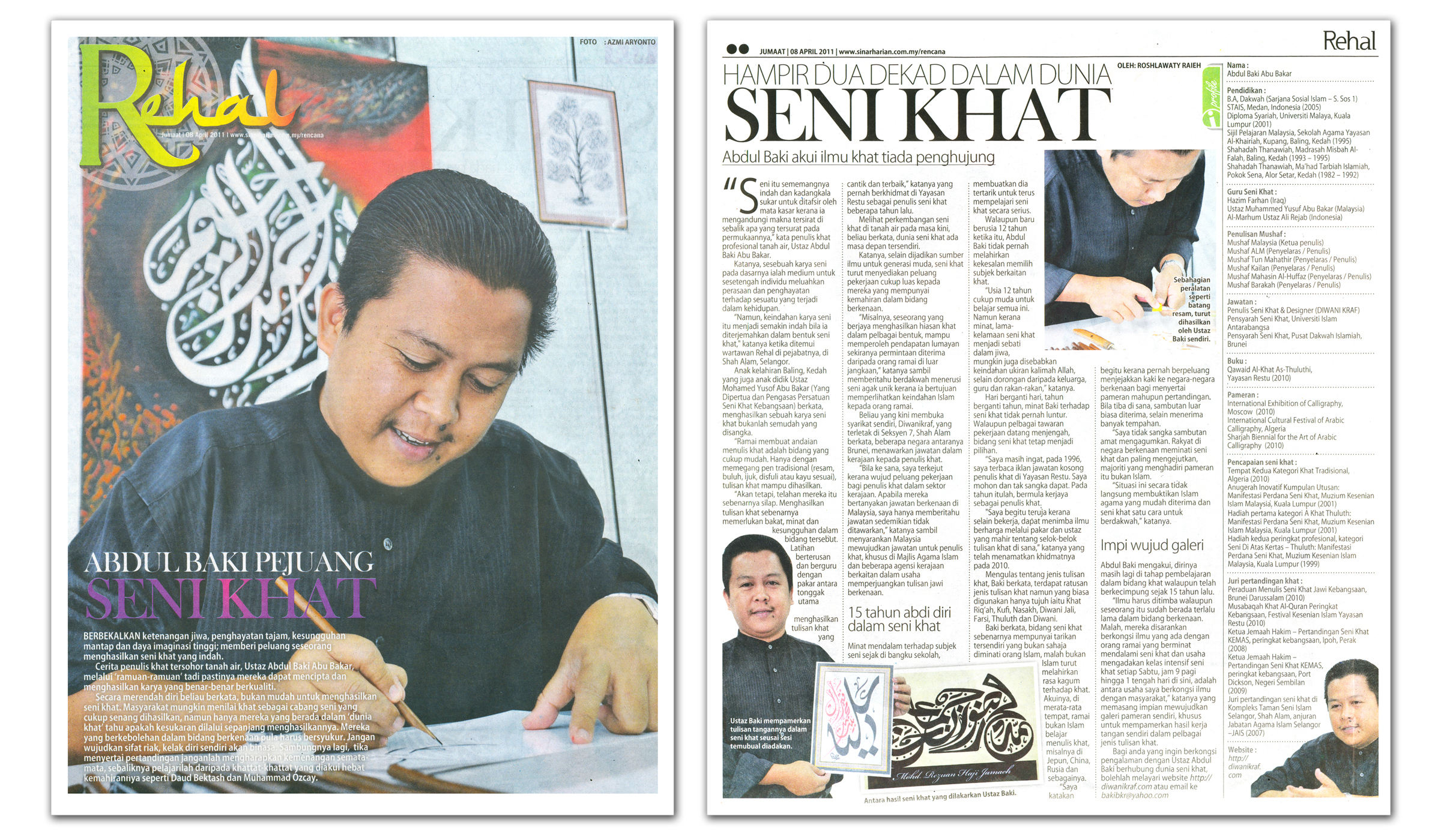Bagi anda yang ingin berkongsi pengalaman dengan Ustaz Abdul Baki berhubung dunia seni khat, bolehlah melayari website http://diwanikraf.com atau email bakibkr@yahoo.com